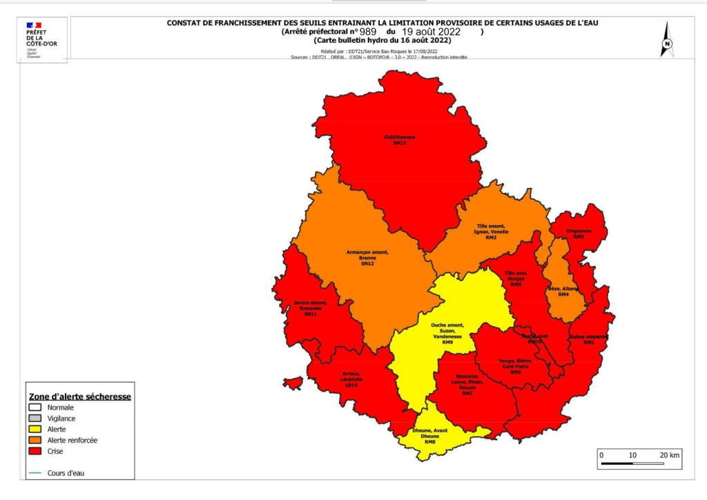 Communiqué de la préfecture de Côte-d’Or, daté du 19 août : « Sécheresse en Côte-d’Or : des territoires en crise. Des nouvelles mesures de restriction applicables à compter du lundi 22 août 2022 ».