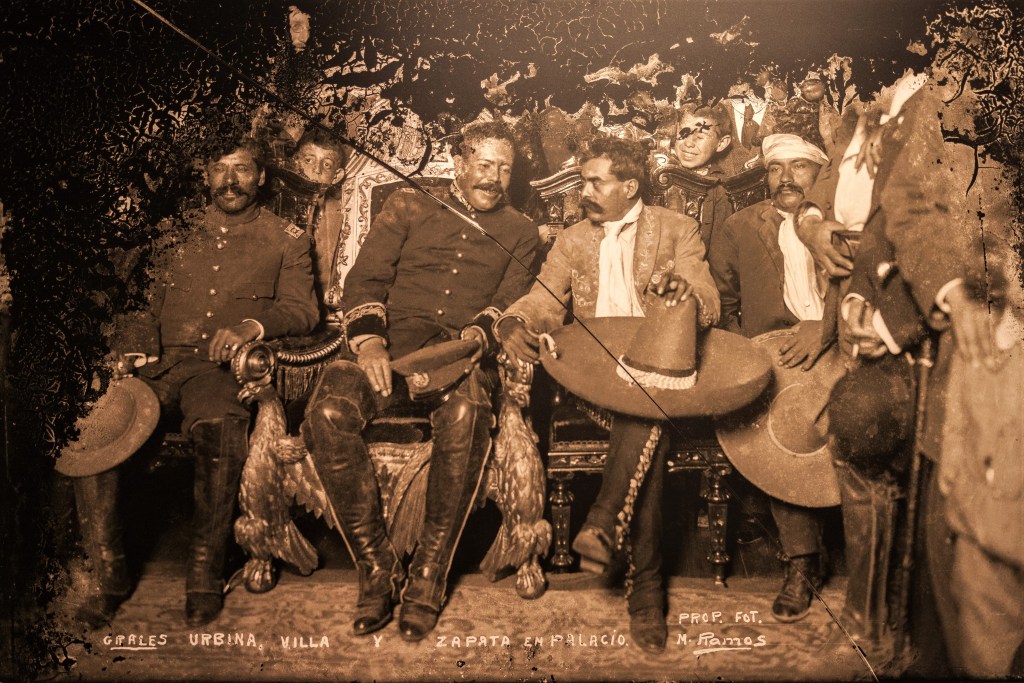 Tomás Urbina (à gauche) aux côtés de Pancho Villa et Emiliano Zapata, au Palais national de Mexico, le 6 décembre 1914. DR