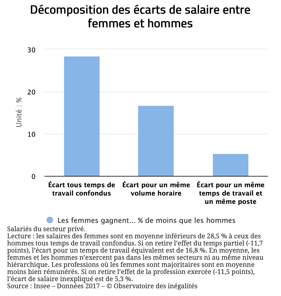 Les salaires des femmes sont largement inférieurs à ceux des hommes. Globalement, tous temps de travail confondus, les femmes touchent 28,5 % de moins que les hommes et 16,8 % de moins si on compare uniquement les temps pleins (Observatoire des inégalités, mars 2022). Encore aujourd’hui, dès leur sortie de formation initiale, pour une même situation, les femmes sont moins bien payées, qu’elles soient cadres ou ouvrières. Les 2/3 des smicards sont des smicardes et les hommes effectuent aussi plus souvent des heures supplémentaires.
