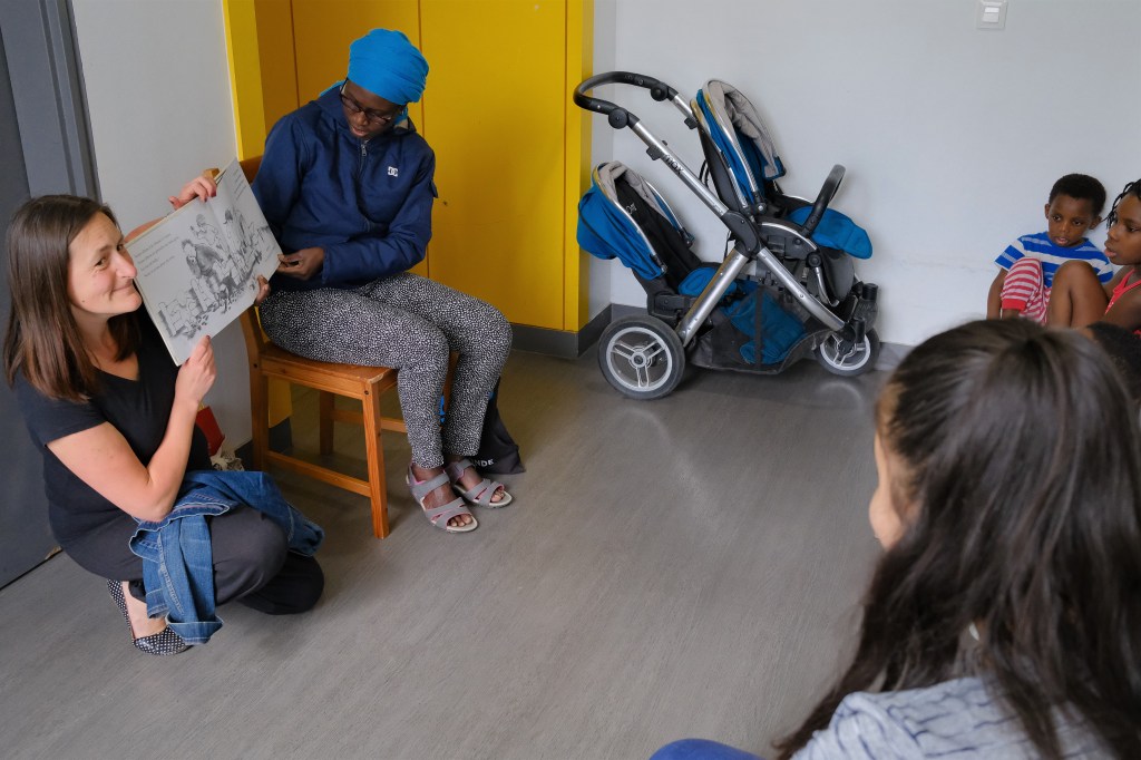 Maïmouna Kebe, volontaire permanente d’ATD-Quart Monde, organise des lectures au pied des immeubles de Noisy-le-Grand (93). Ici, en avril 2020, devant la fenêtre de Jean-Robert et de ses quatre enfants : Brady, 10 ans, Océane, 7 ans, Lionel, 6 ans, et Jean-Robert Junior, 4 ans. Photo : © Ishta