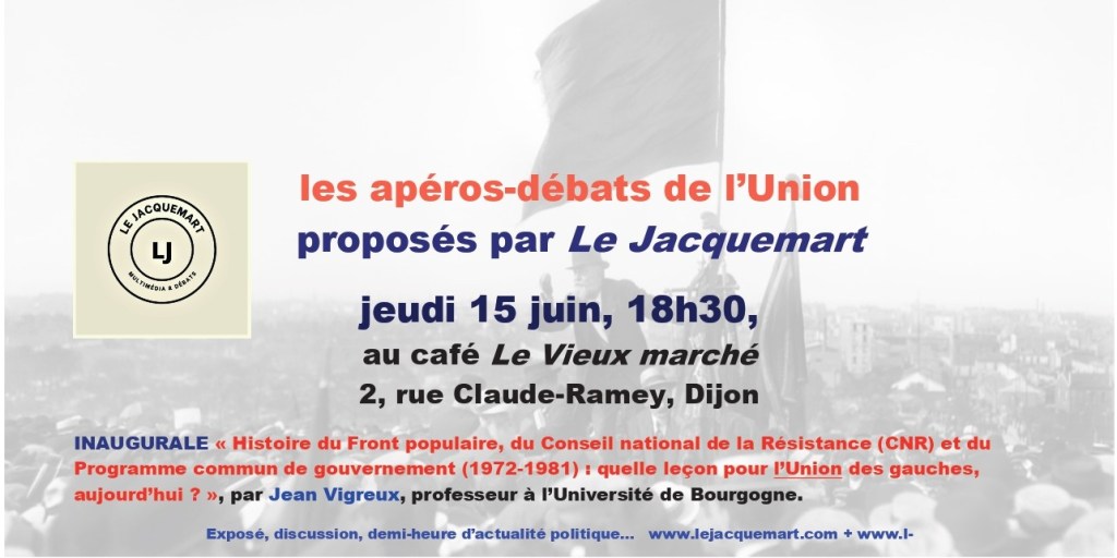 Le Jacquemart vous invite à participer au premier apéro-débat de l’Union organisé autour de l’intervention de Jean Vigreux (professeur à l’université de Bourgogne, Maison des sciences de l’homme – Dijon) sur l’histoire du Front populaire (1936), du Conseil national de la Résistance (1944) et du Programme commun de gouvernement (1972-1981). L’éventuelle « leçon » à tirer de cette histoire, pour la nouvelle Union des gauches, sera envisagée.