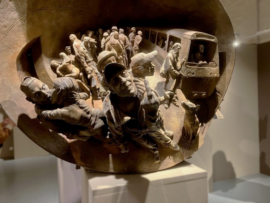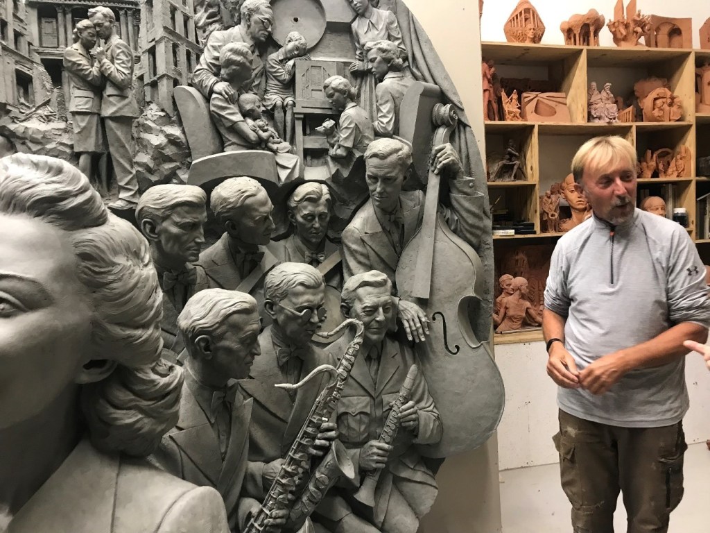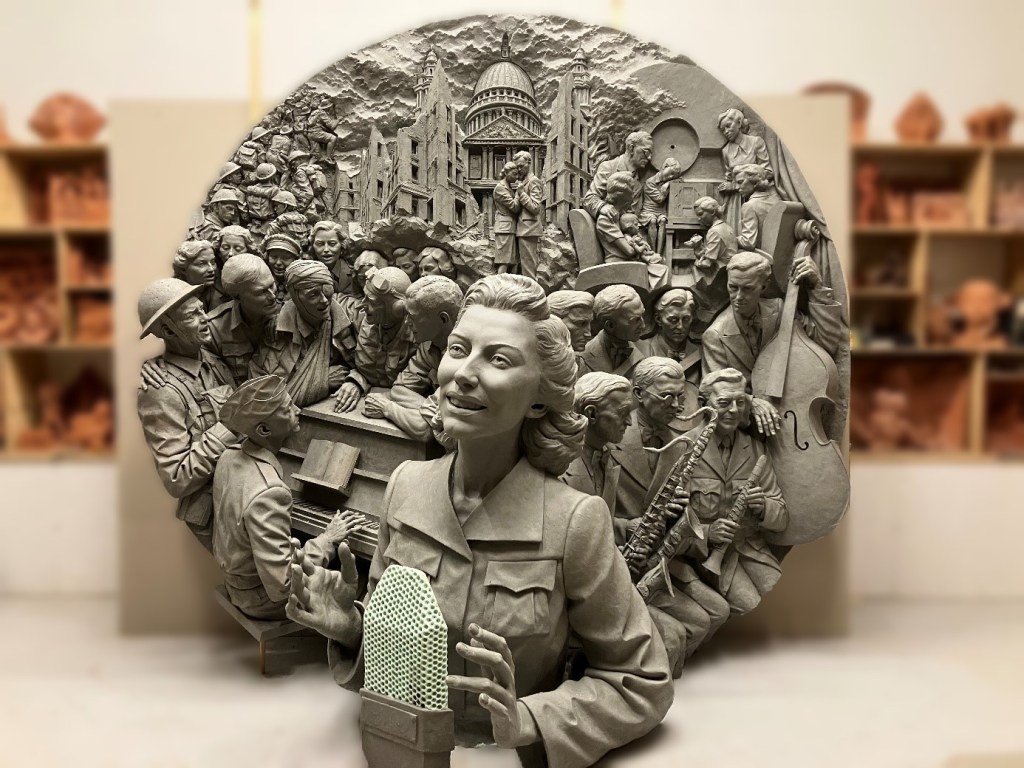 A peine sommes-nous rentrés dans son atelier que nous sommes saisis par une œuvre monumentale sur laquelle il travaille actuellement : une sculpture en relief, hommage à la chanteuse britannique Vera Lynn, légende au Royaume-Uni qui avait inspiré Pink Floyd et soutenu le moral des troupes durant la Deuxième Guerre mondiale. Elle s’est éteinte en 2020 à l’âge de 103 ans.
