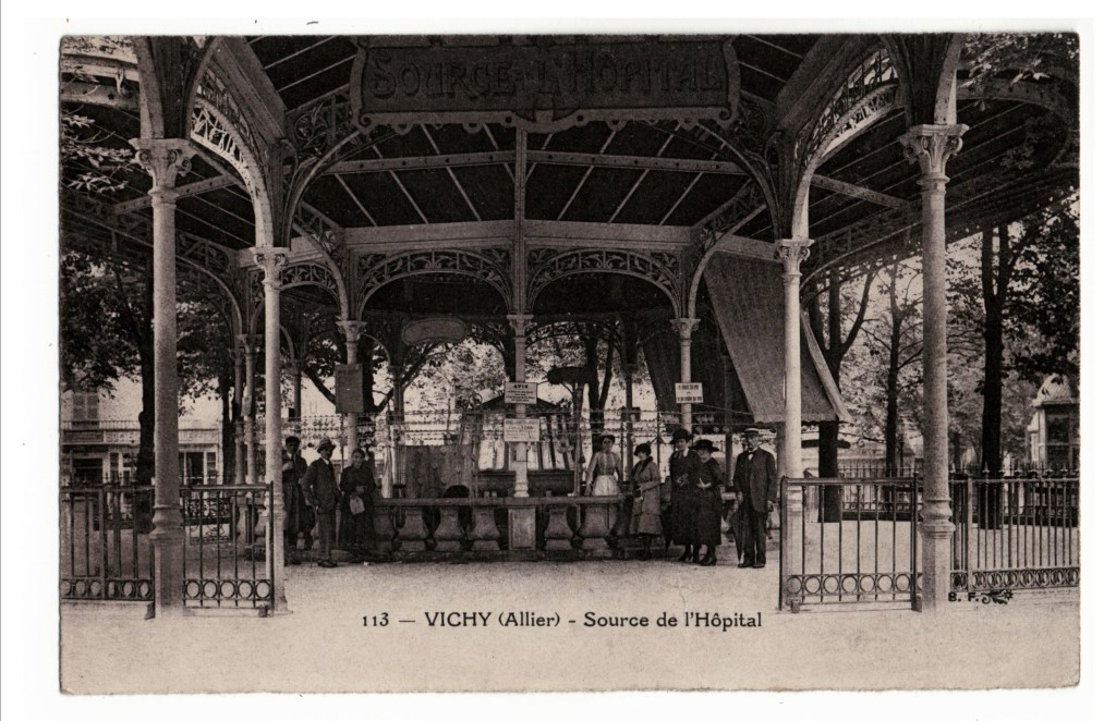 « Quelle que soit l’heure à laquelle on prend son bain, on est très matinal à Vichy. Dès six heures du matin, les buveurs se dirigent vers la source qui leur est ordonnée. A neuf heures, distribution des lettres et des journaux. A dix heures, on déjeune et l’on mange des carottes, légume obligatoire dans l’alimentation des malades. De onze heures à deux heures, on joue au Whist et aux dominos ; les dames brodent et les demoiselles s’escriment sur le piano. A deux heures, toilette générale. A trois heures, nouvelle excursion aux sources. De trois heures et demie à quatre heures et demie, musique dans le parc. Aussitôt après la dernière polka, troisième excursion aux sources. Soudain toutes les cloches des hôtels se mettent en branle, invitant au dîner, servi à cinq heures précises, avec accompagnement de carottes, cela va de soi. De six à sept heures, on abat des quilles, on cherche à loger une pièce de dix centimes dans un sabot, on gagne ou l’on ne gagne pas ; on fait l’aumône à des nuées de petits Savoyards qui montrent « la marmotte en vie », et surtout, assis sur les bancs de bois peints en vert placés devant la porte des hôtels, on médit du voisin. De sept à huit heures, musique militaire. De huit heures à dix, réunions dans les salons de l’établissement thermal, bal, concert, ou spectacle, et tout Vichy dort à onze heures. »
