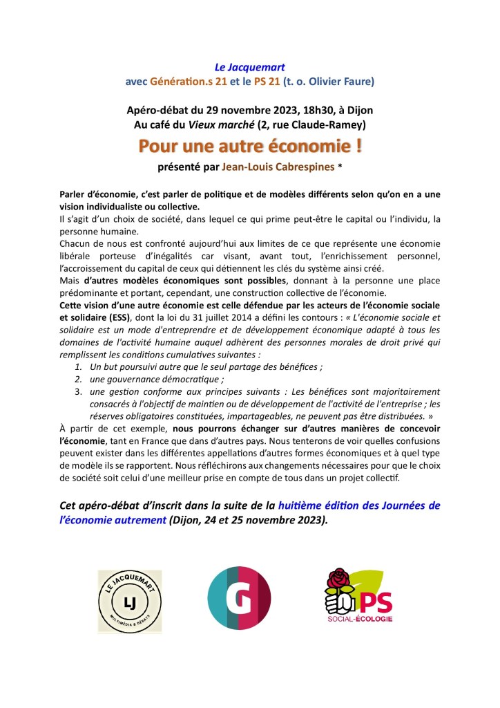 A partir de cet exemple, nous pourrons échanger sur d’autres manières de concevoir l’économie, tant en France que dans d’autres pays. Nous tenterons de voir quelles confusions peuvent exister dans les différentes appellations d’autres formes économiques et à quel type de modèle ils se rapportent. Nous réfléchirons aux changements nécessaires pour que le choix de société soit celui d’une meilleur prise en compte de tous dans un projet collectif.