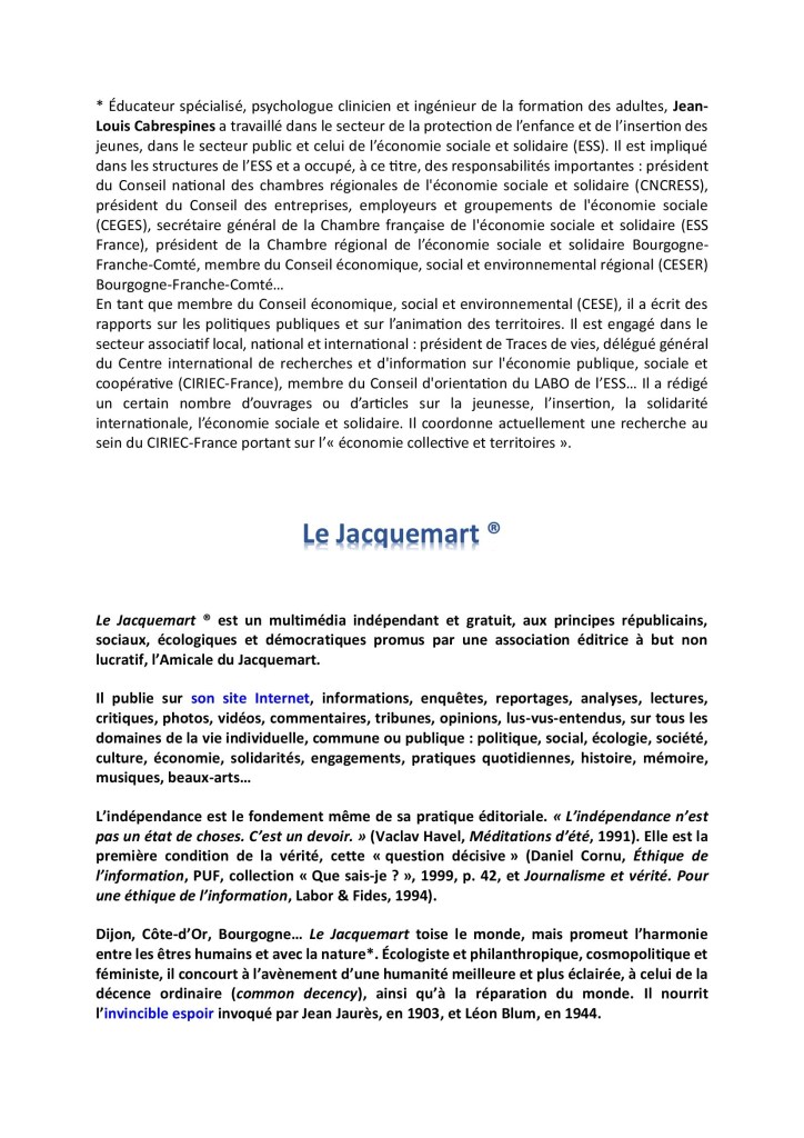 * Éducateur spécialisé, psychologue clinicien et ingénieur de la formation des adultes, Jean-Louis Cabrespines a travaillé dans le secteur de la protection de l’enfance et de l’insertion des jeunes, dans le secteur public et celui de l’économie sociale et solidaire (ESS). Il est impliqué dans les structures de l’ESS et a occupé, à ce titre, des responsabilités importantes : président du Conseil national des chambres régionales de l’économie sociale et solidaire (CNCRESS), président du Conseil des entreprises, employeurs et groupements de l’économie sociale (CEGES), secrétaire général de la Chambre française de l’économie sociale et solidaire (ESS France), président de la Chambre régional de l’économie sociale et solidaire Bourgogne-Franche-Comté, membre du Conseil économique, social et environnemental régional (CESER) Bourgogne-Franche-Comté…
