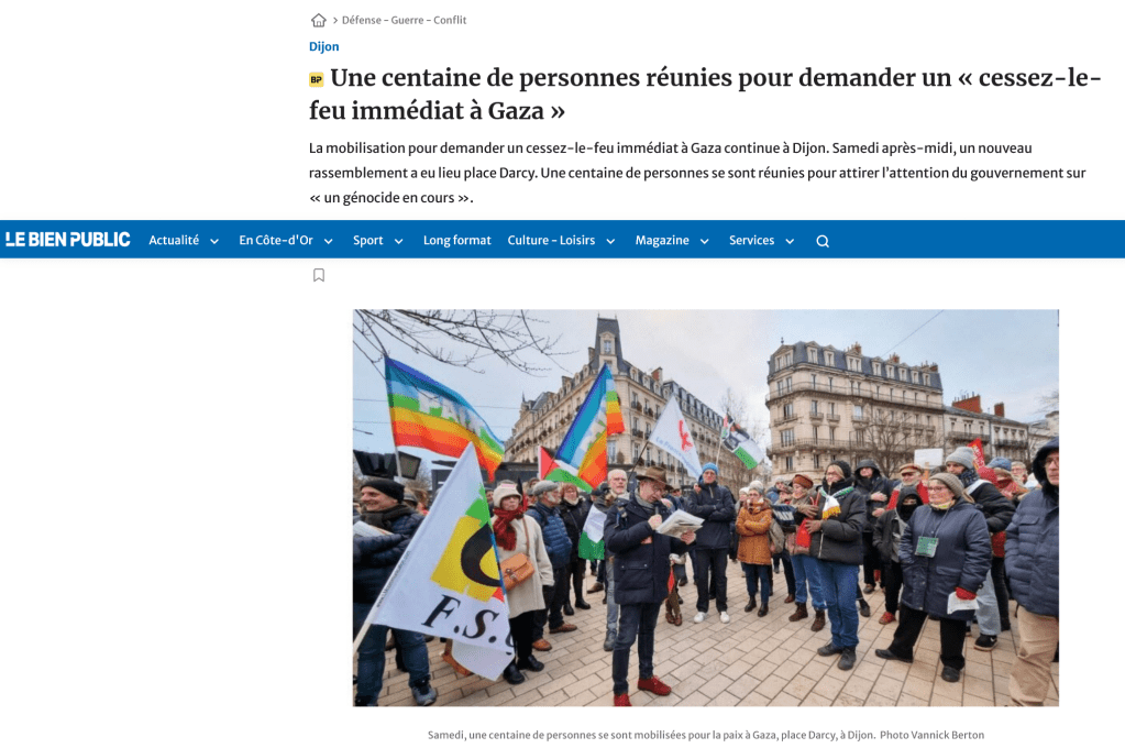 Encore aujourd’hui, j’observe, à Dijon, ce spectacle rituel, pitoyable, comme presque chaque samedi, d’un petit rassemblement des idiots utiles du Hamas, antisémites plus ou moins conscients (ah, le masque de l’antisionisme !), qui clament « Cessez-le-feu ! », et qui essaient de faire croire (mais qui les croit encore ?) qu’ils sont mobilisés pour « une paix juste et durable » entre Israéliens et Palestiniens.