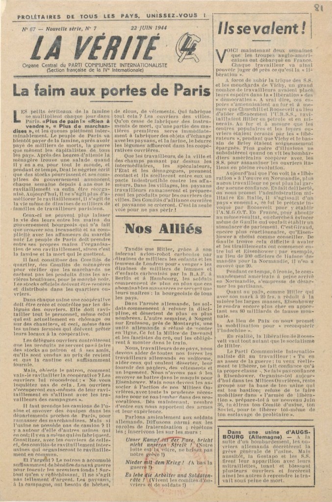 La Vérité, organe central des Comités pour la IVe Internationale (trotskistes). On y lit, en pleine bataille pour la Libération (juin 1944) : « Parlons amicalement aux soldats allemands » considérés comme étant « Nos alliés ! », ou encore « Ils se valent ! », à propos de Hitler, Churchill et Roosevelt…