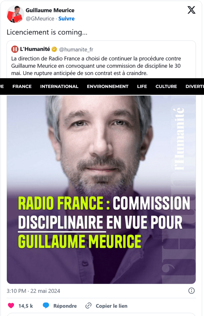 Guillaume Meurice, humoriste à France Inter, est convoqué en vue d’une « rupture anticipée pour faute grave ». Il a lui-même annoncé, mercredi 22 mai, avoir été convoqué à une commission de discipline le 30 mai par la direction des ressources humaines de la radio publique.