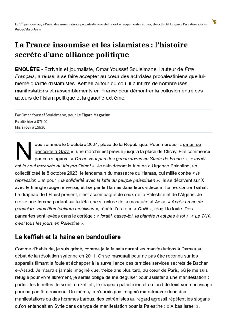 Le Figaro – ENQUÊTE – Écrivain et journaliste, Omar Youssef Souleimane, l’auteur de Être Français, a réussi à se faire accepter au cœur des activistes propalestiniens que lui-même qualifie d’islamistes. Keffieh autour du cou, il a infiltré de nombreuses manifestations et rassemblements en France pour démontrer la collusion entre ces acteurs de l’islam politique et la gauche extrême.
