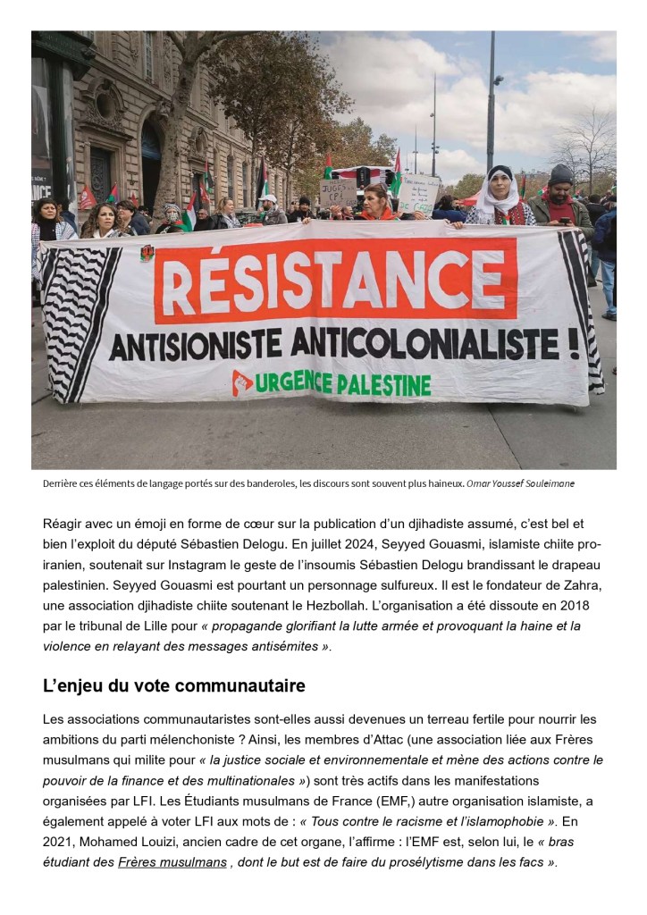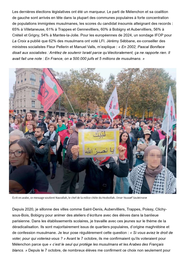 « Il ressort que les sympathisants de La France insoumise (LFI) sont particulièrement surreprésentés dans les deux groupes à tendance antisémites : 46% d’entre eux s’y retrouvent. Ce phénomène est encore plus marqué dans le groupe 5, qui se caractérise par une adhésion à de nombreux préjugés antisémites et une tolérance envers les actes antisémites. En effet, 19% des sympathisants de LFI appartiennent à ce groupe (contre 10% des Français). (…) Au final, on observe donc bien une surreprésentation des sympathisants d’extrême gauche en général et LFI en particulier dans les deux groupes à tendance antisémite. On peut donc raisonnablement penser qu’une partie des personnes affiliées à l’extrême gauche entretiennent bien un rapport « particulier » avec les juifs. »