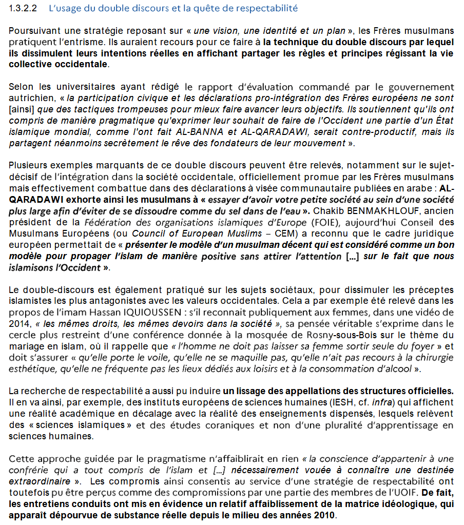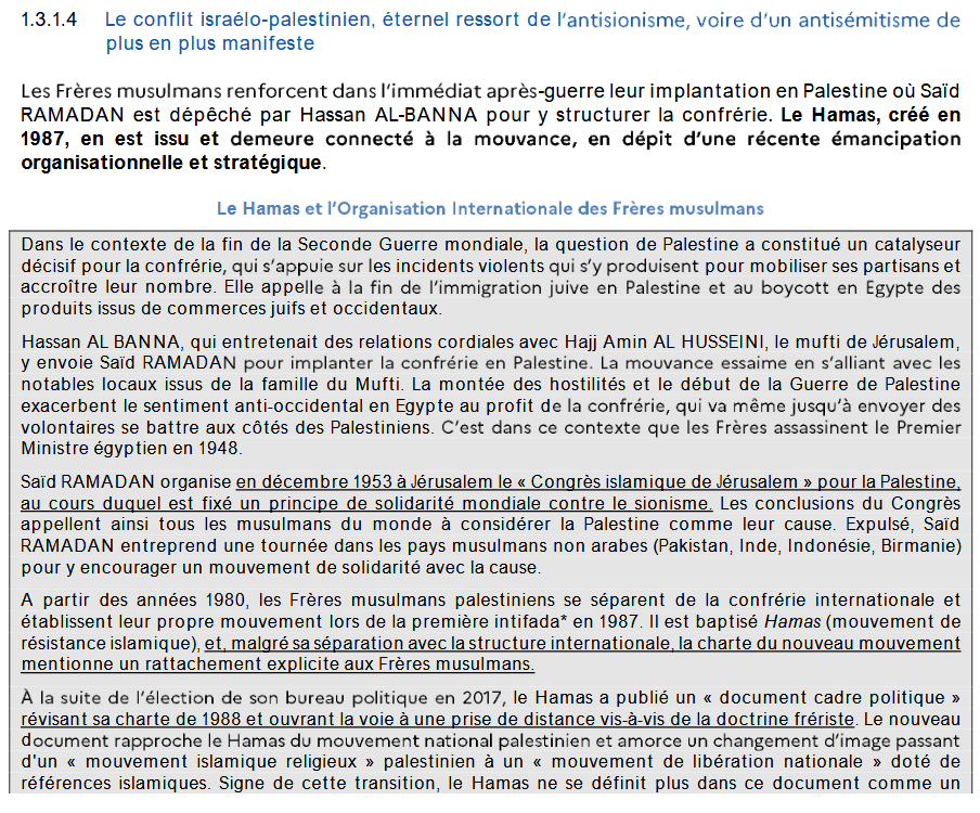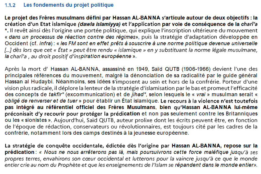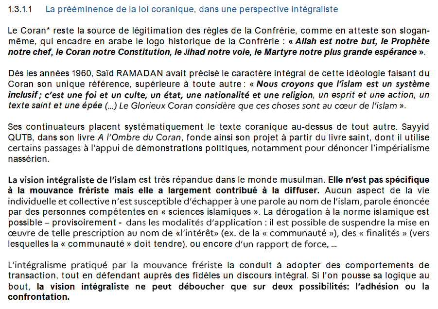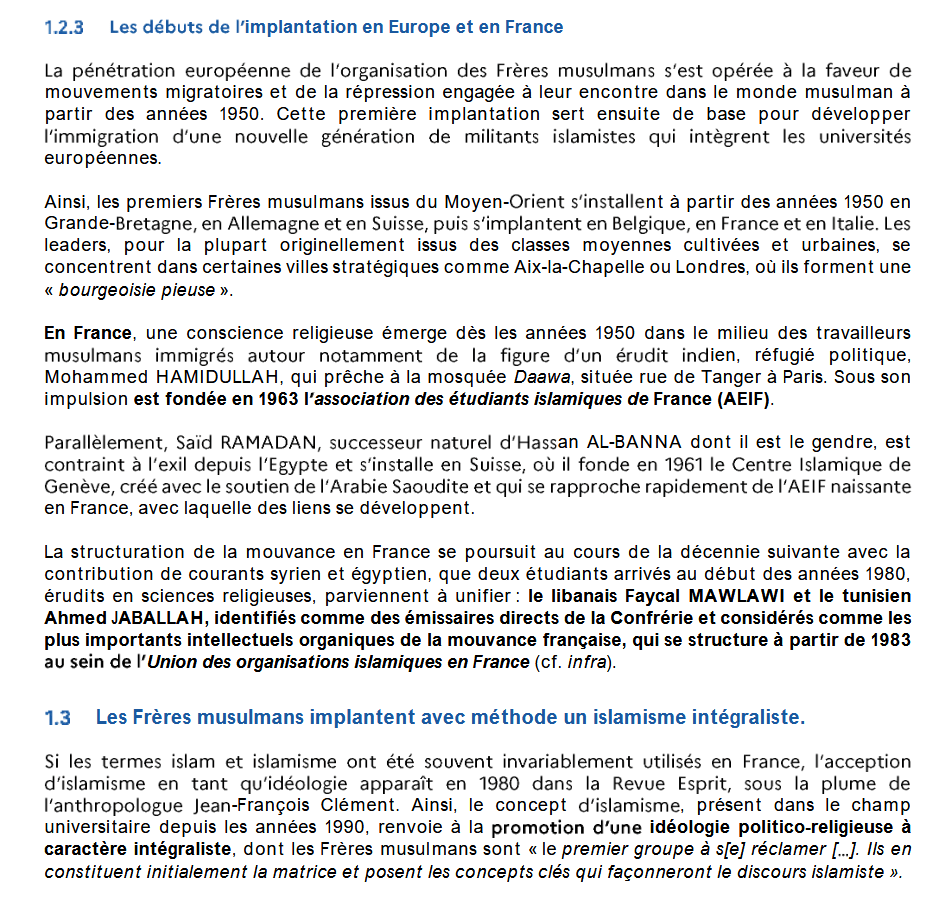 3 – Les Frères musulmans s’implantent en France dès les années 1950 et propagent, dès lors, un « islamisme intégraliste » (p. 14) :
