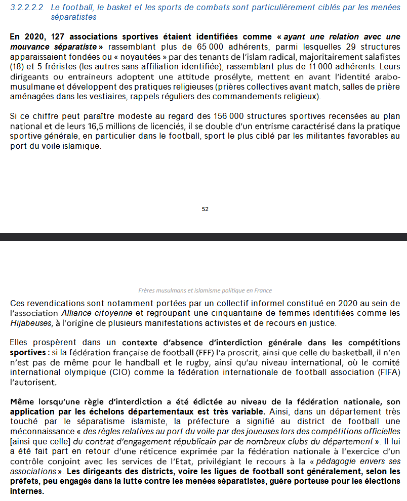 9 – De nombreuses associations sportives sont gangrenées par le séparatisme islamiste (pp. 52 et 53) :