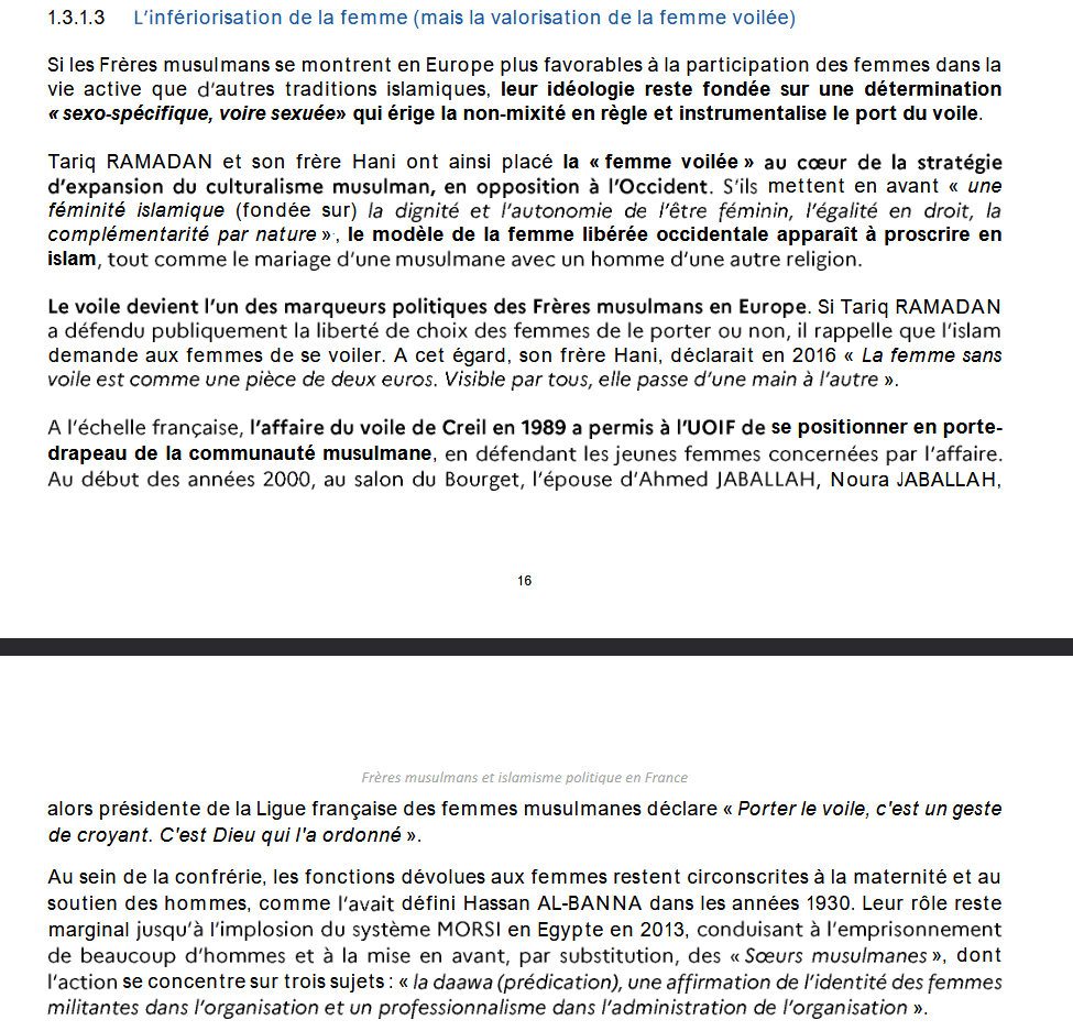 5 – L’islamisme des Frères musulmans institue une « infériorisation » des femmes et promeut le port du voile comme « marqueur politique » (pp. 16 et 17) :