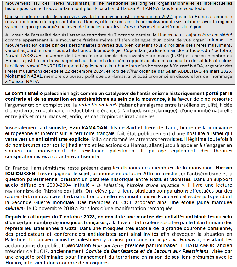 POST-SCRIPTUM : Le texte que Le Jacquemart a lu ne comporte pas la plupart des noms des personnes interviewées par ses auteurs. Même les noms des deux auteurs – un diplomate, ex-ambassadeur en Algérie, en Arabie saoudite, aux Émirats arabes unis, en Libye et en Tunisie, et un préfet ayant exercé dans l’Aube et les Yvelines –, Pascal Courtade et François Gouyette, qui avaient pourtant été rendus publics par le ministère de l’Intérieur au moment de la commande (mai 2024), ont été gommés à l’heure de la publication. Les deux auteurs ont mené des entretiens avec 45 universitaires français et étrangers, effectué une dizaine de déplacements en France et quatre en Europe, organisé des rencontres avec des responsables musulmans nationaux et locaux. Ils commencent leur rapport par un rappel historique et idéologique qui remonte à la fondation de la confrérie par Hassan Al-Banna (1906-1949) en 1928. Ils exposent sa vision « intégraliste » de l’islam, qui ne distingue pas vie privée et vie politique, son fonctionnement pyramidal et son obsession pour la prédication à tous les niveaux de la société.