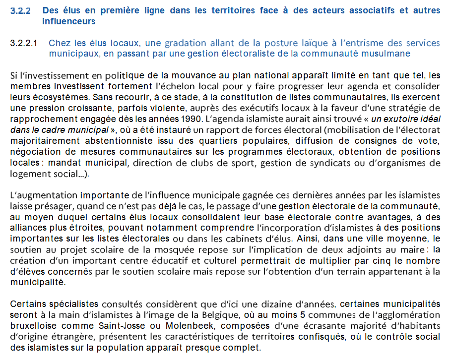 8 – Des élus locaux sous pression, voire sous influence islamiste, acceptant un entrisme municipal, associatif, syndical, social…, parce qu’ils sont captifs d’un clientélisme communautaire (p. 51) :