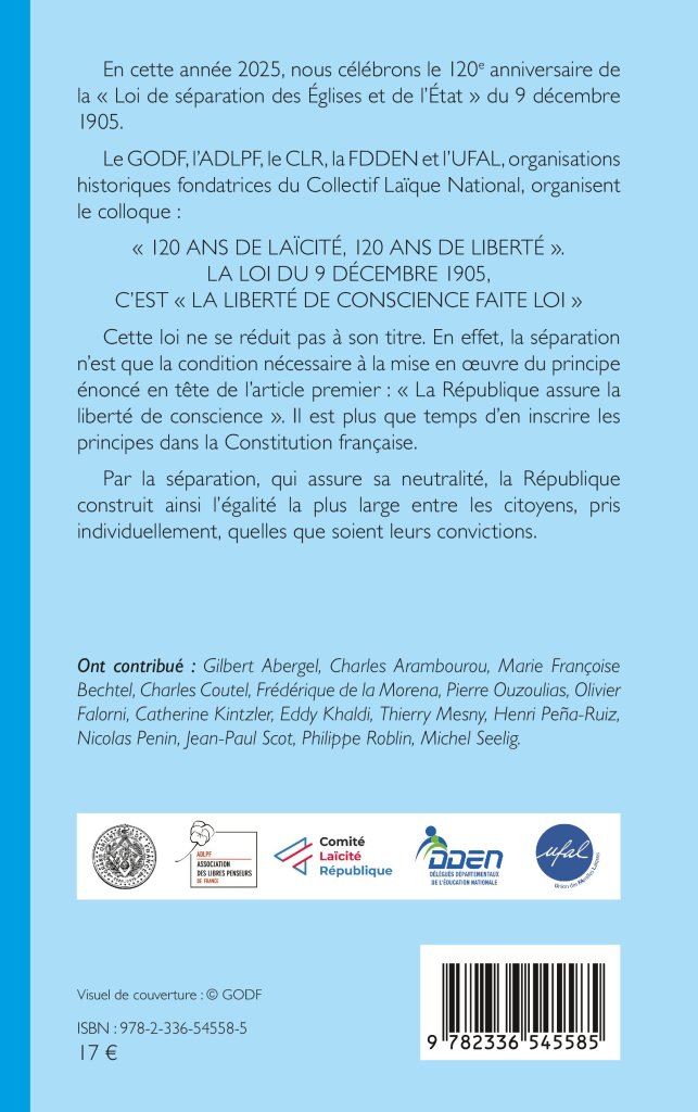 Vient de paraître, chez L’Harmattan : 120 ans de laïcité, 120 ans de liberté